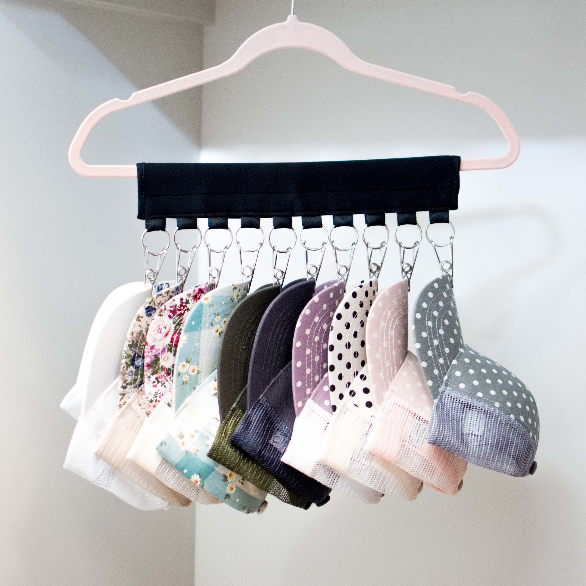 Finally! A solution for storing all those hats laying around your closet! Our amazing Hat Organizer does it all! Simply wrap around any hanger and instantly have a space-saving solution for 10 hats! Keep them organized, keep them from getting crushed, keep them easy to reach. These are a lifesaver...your closet will thank you!